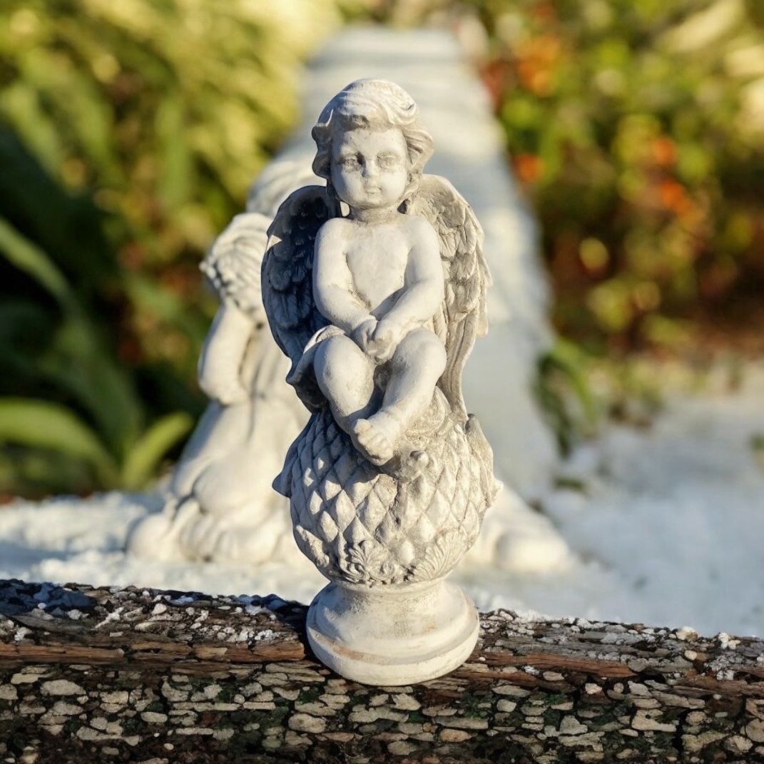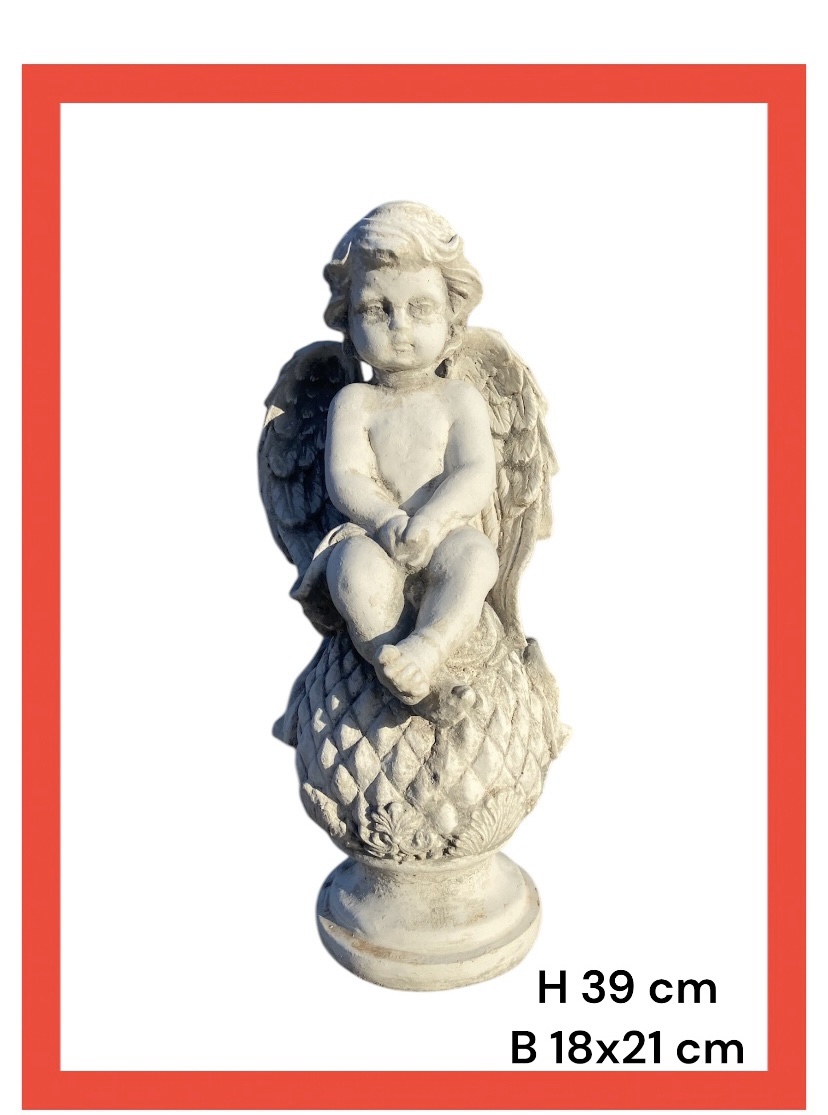 Statua angelo putto seduto su pigna in cemento